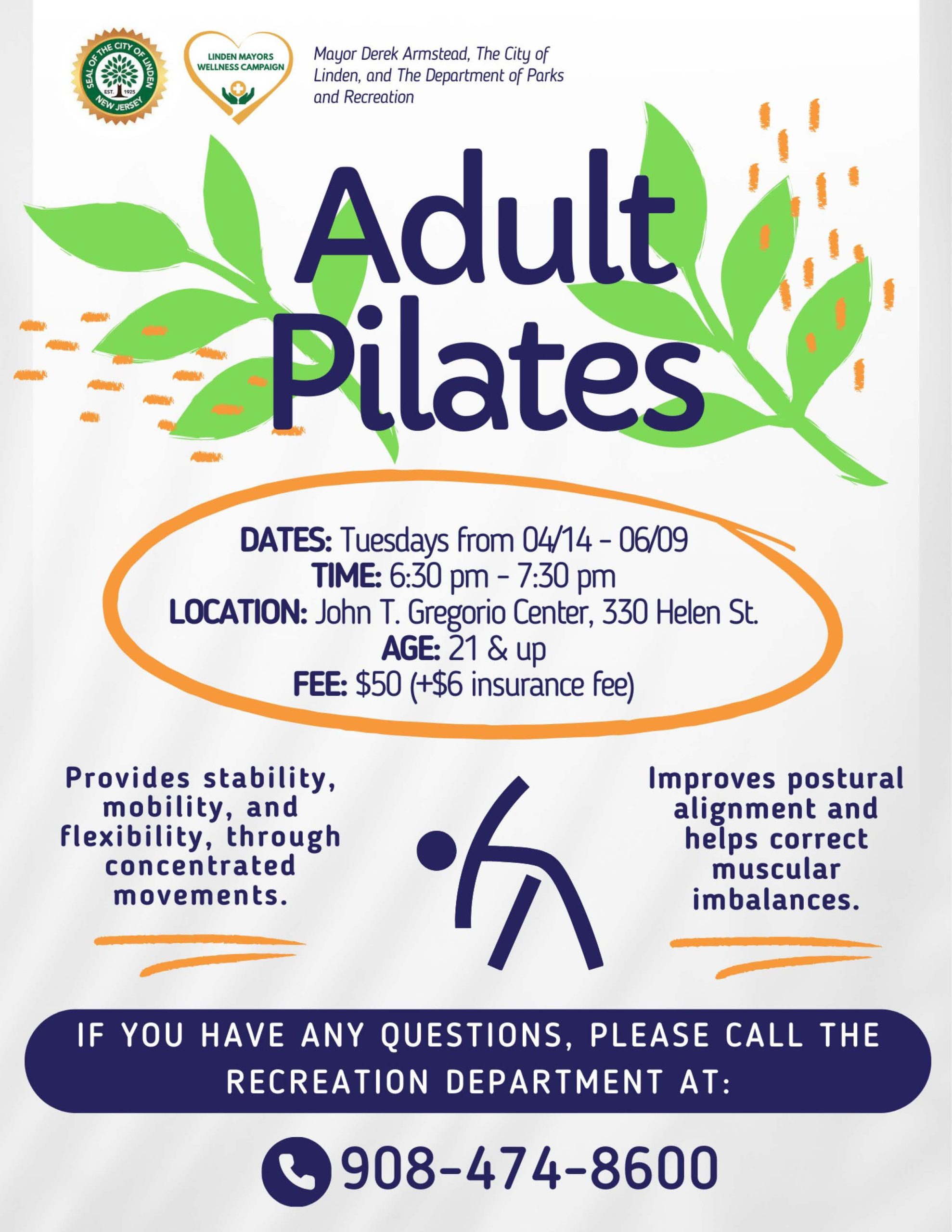 Mayor Derek Armstead, the City of Linden, and the Department of Parks & Recreation are pleased to offer Adult Pilates.