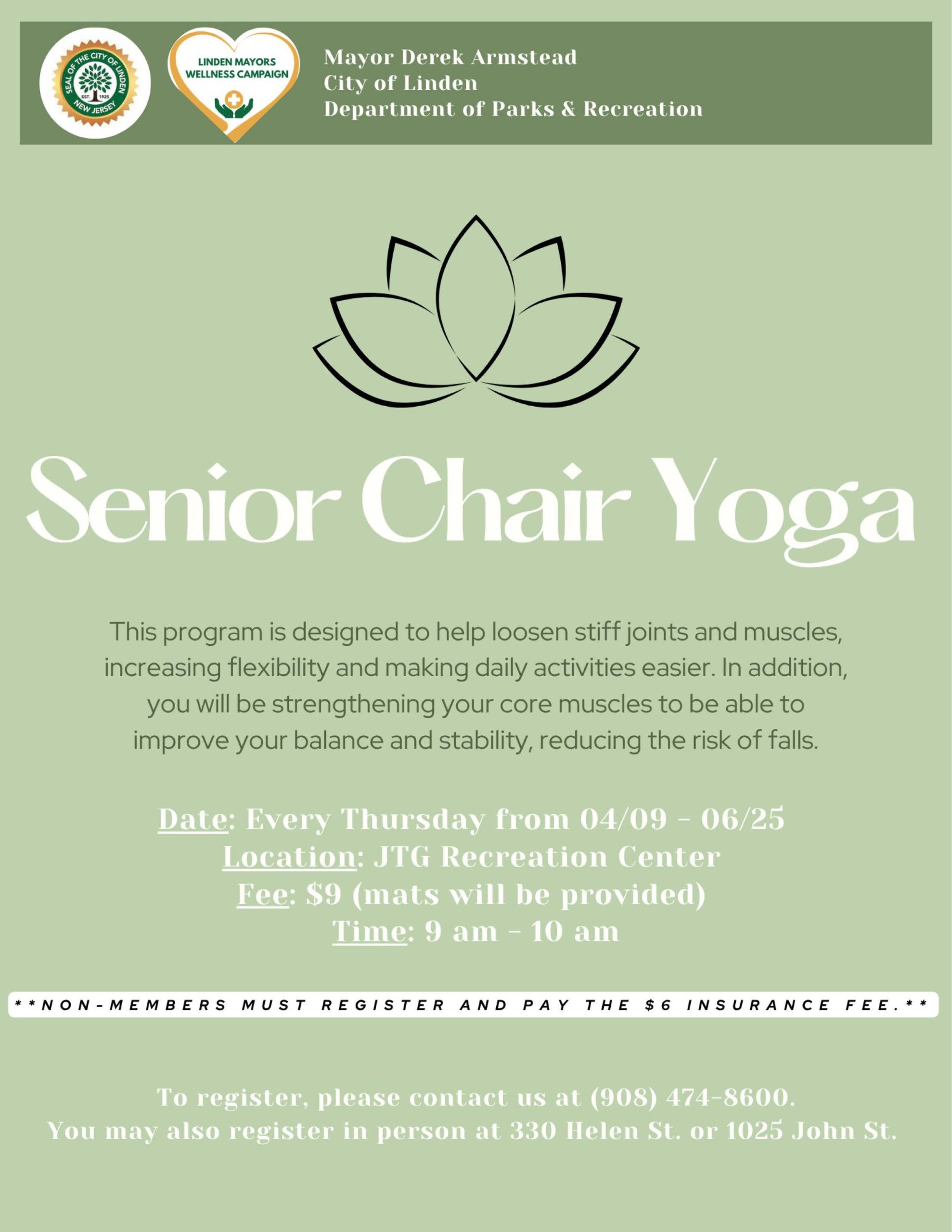 Mayor Derek Armstead, the City of Linden, and the Department of Parks & Recreation are pleased to offer Senior Chair Yoga.